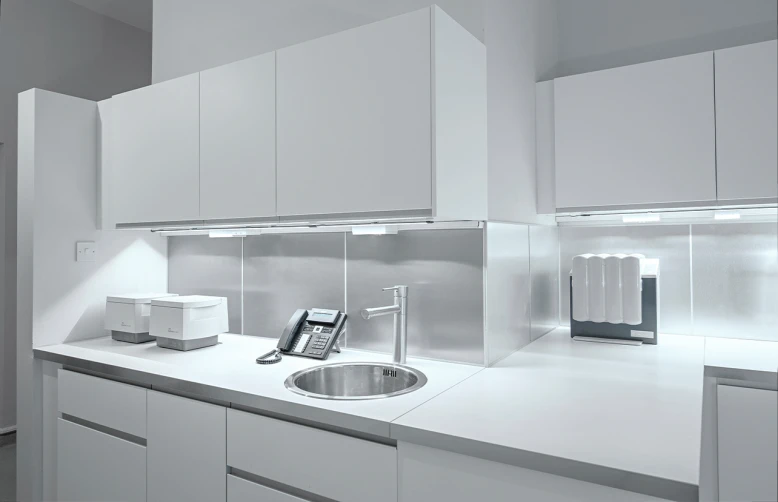 A soft, textured palette echoes into the strictly dental spaces in an effort to balance out the stark, white cabinetry and necessary stainless-steel finishes.